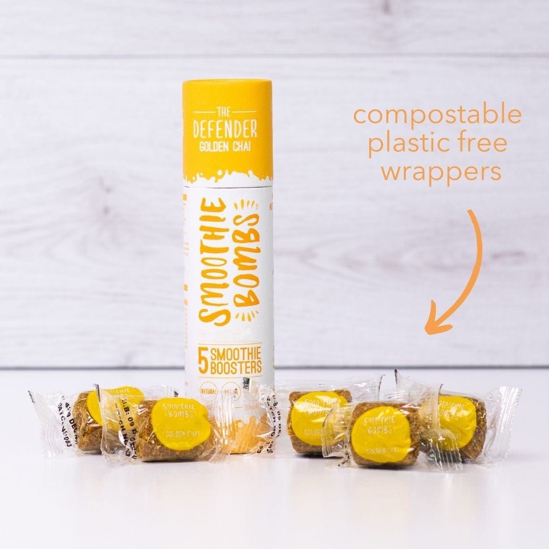 2. Crumble 1 Defender Golden Chai Smoothie Bomb for nutrition & flavour.